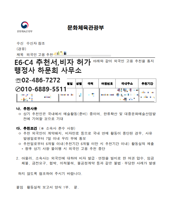추천서 발급과 사증발급신청을 위해, 초청인과 피초청인 각각 고용계약서,전속계약서,출연계약서,사업 및 활동계획서 등 정해진 규정에 따라 꼼꼼한 자료를 준비하여야 합니다.